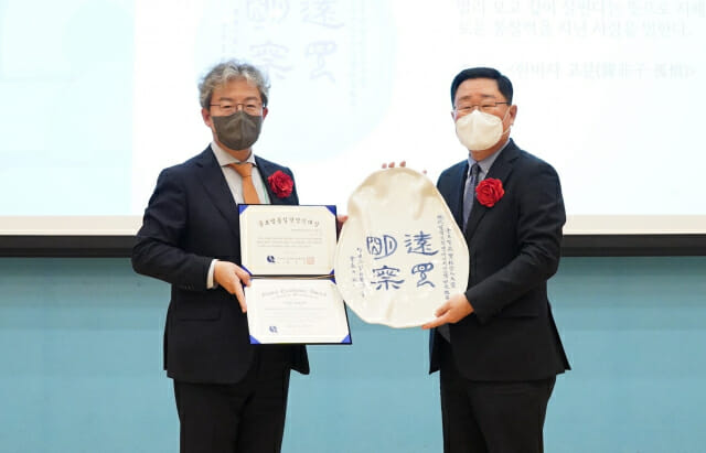 현대일렉트릭 대표이사 조석 사장(오른쪽)이 21일 경북 포항시 포항공과대학교에서 열린 ‘2022년 한국품질경영학회 추계 학술대회 품질상 시상식’에서 ‘글로벌품질경영인 대상’을 수상했다.