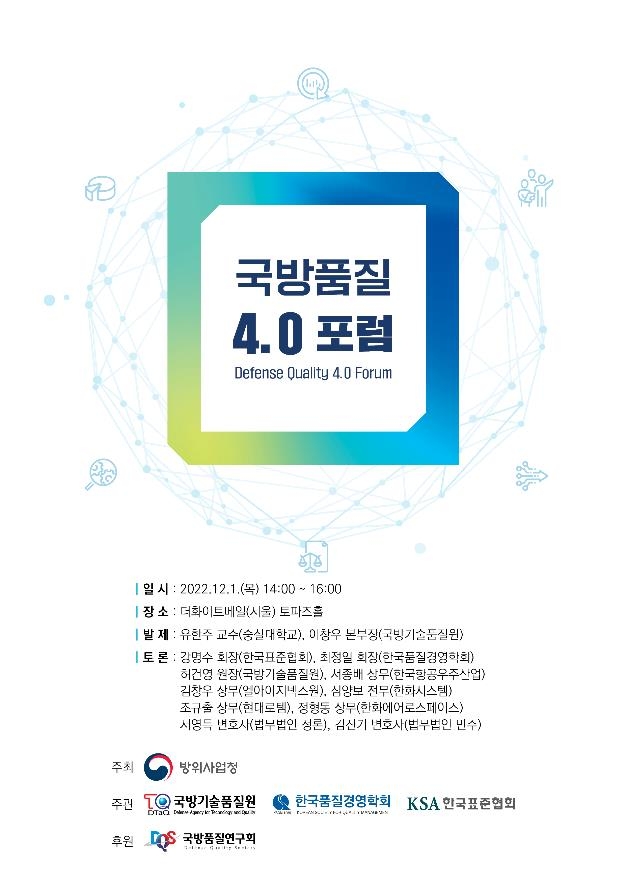 유한주 숭실대학교 교수와 이창우 국방기술품질원 생산품질경영본부장이 발제를 맡고 강명수 한국표준협회 회장, 최정일 한국품질경영학회 회장, 허건영 국방기술품질원 원장 등이 패널로 나선다.