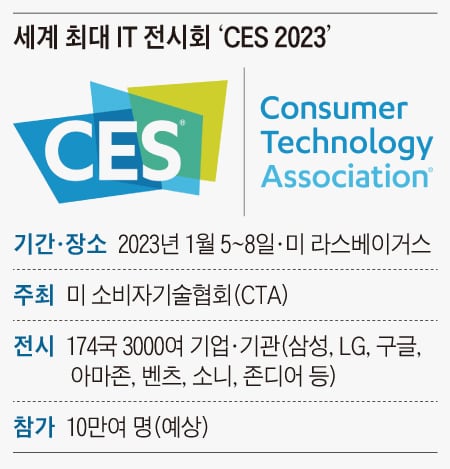 자 그럼 올해 CES 2023 얘기를 해 보겠습니다. 올해 CES 본행사는 1월5일부터 8일까지 라스베이거스 컨벤션센터(LVCC) 및 주요 호텔에서 열립니다. 주제는 ‘Be in it(빠져들어라)’입니다. 예상 관람객은 10만명 이상인데 이 가운데 35% 이상이 미국 밖에서 찾아올 전망입니다. 170국 이상에서 라스베이거스를 찾습니다. 참가 기업은 삼성·SK·LG·구글 등 최대 3000여개 수준이 될 것 같습니다. 1000개 이상은 CES에 처음 데뷔합니다. 다만 아직 엔데믹은 아닙니다. 역대 최대 규모였던 CES 2020에는 관람객이 17만명, 전시업체는 4000곳이 넘었습니다. 매년 CES 전시 카테고리를 다변화하고 있는 CTA는 올해 41개의 카테고리를 선정했습니다. 5G, 인공지능, 로보틱스, 드론, 증강현실(AR), 가상현실(VR), 모빌리티 처럼 주류가 된 기술이 있는가 하면 디지털 헬스케어, 지속 가능성, 스포츠 같은 이머징 테크도 대거 등장합니다.