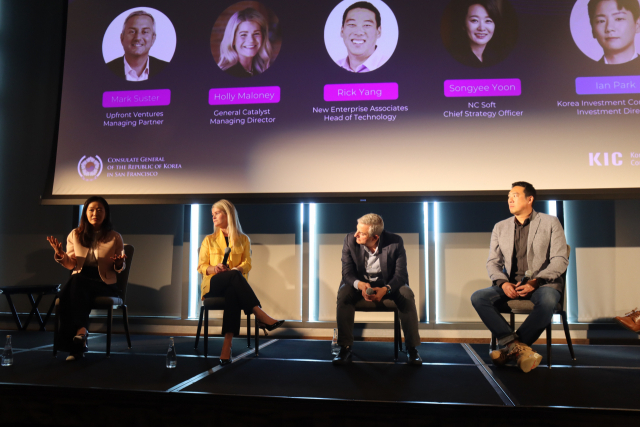 15일(현지 시간) 미국 샌프란시스코공항 그랜드하이엇호텔에서 한국투자공사(KIC)와 주샌프란시스코총영사관이 주최한 ‘테크 인베스트먼트 아웃룩’ 포럼에서 윤송이(왼쪽부터) 엔씨소프트 CSO, 홀리 멀로니 제너럴캐털리스트 총괄, 마크 서스터 업프론트벤처스 대표, 릭 양 NEA 파트너, 이안 박 KIC 디렉터 등이 발언하고 있다. 샌프란시스코=정혜진 특파원
