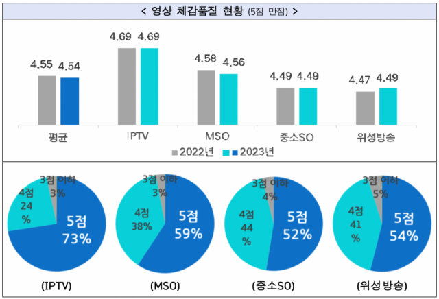 영상 체감품질은 전체 평균 4.54점(5점 척도)으로 전반적으로 우수했다. 유형별로 보면, IPTV 4.69점, MSO 4.56점이며, 중소SO와 위성방송은 4.49점으로 나타났다. 멈춤‧깨짐 등 이상 화면 발생 빈도는 편당 평균 0.13회로 전년도(0.16회)에 비해 향상됐다.